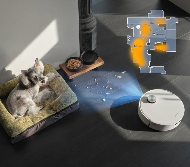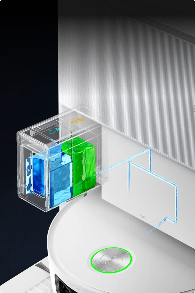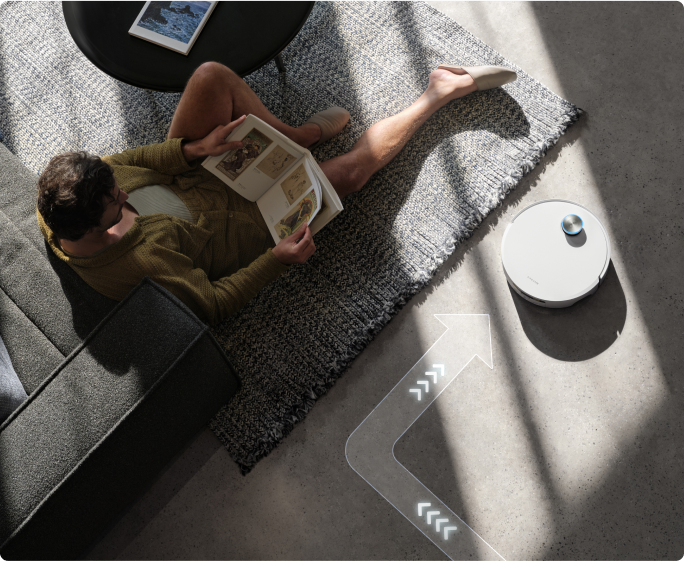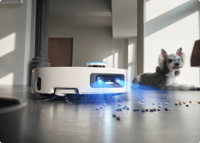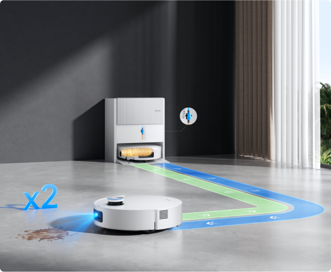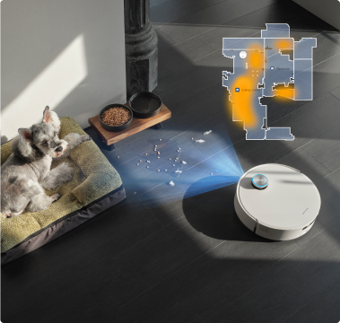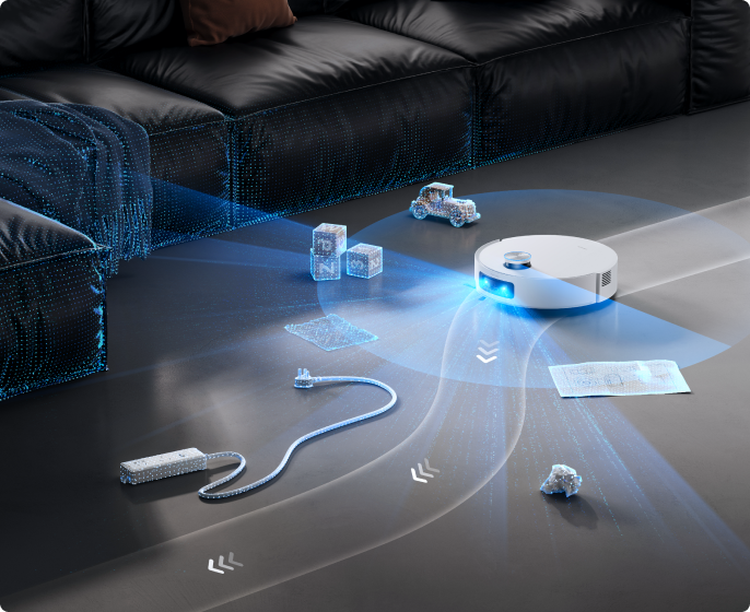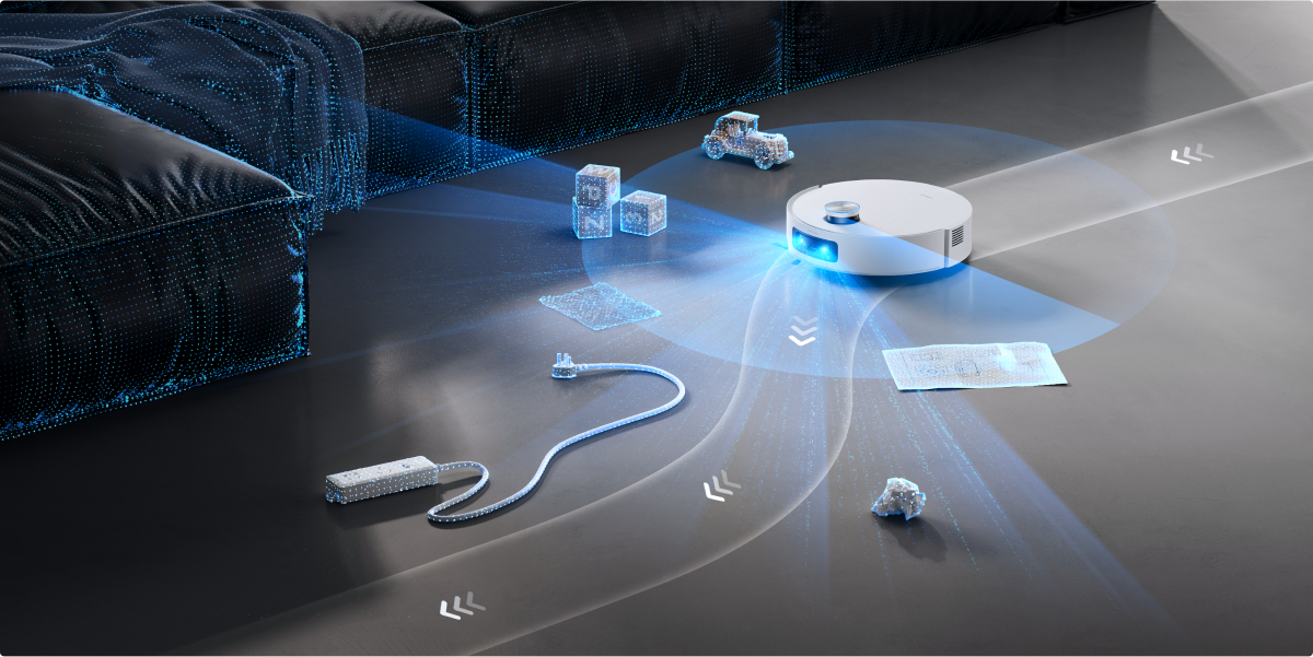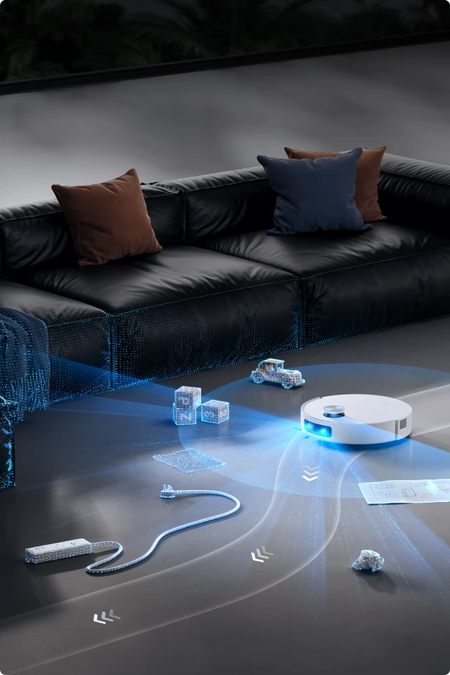På samme måde som mennesker opfatter omgivelserne, registrerer to HD AI-kameraer dybdeoplysninger og danner 3D-data, så robotstøvsugeren nemt undgår flere end 240* genstande med et præcisionsniveau ned til 1 mm*.AstroVision™ er revolutioneret af NVIDIA Isaac SIM og kontinuerlig forstærkningsindlæring og leverer nu ultrapræcis dynamisk forhindring. Oplev optimeret navigationseffektivitet i miljøer med høj interferens og konstant forandring.