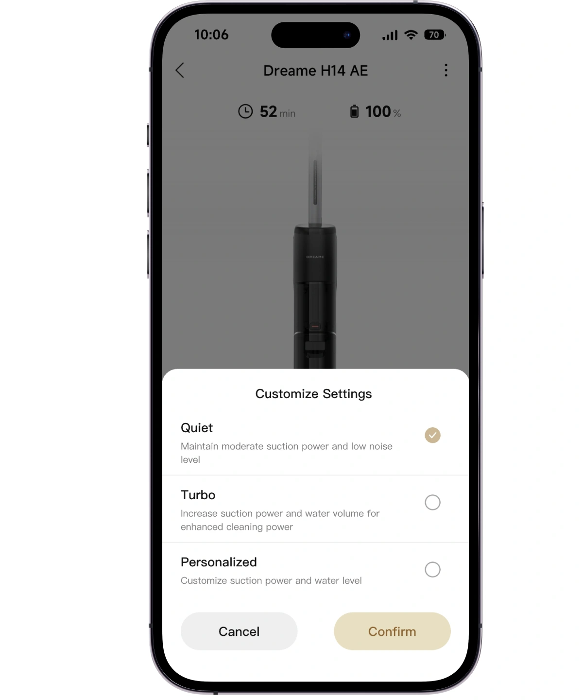 *Funktionen anbefales ikke til tæpper, der er over 3 cm høje, da højere tæpper kan være udsat for dampdannelse. Indstillingerne for rengøring af tæpper med mellemstor til lang luv skal aktiveres manuelt via rengøringsappen.