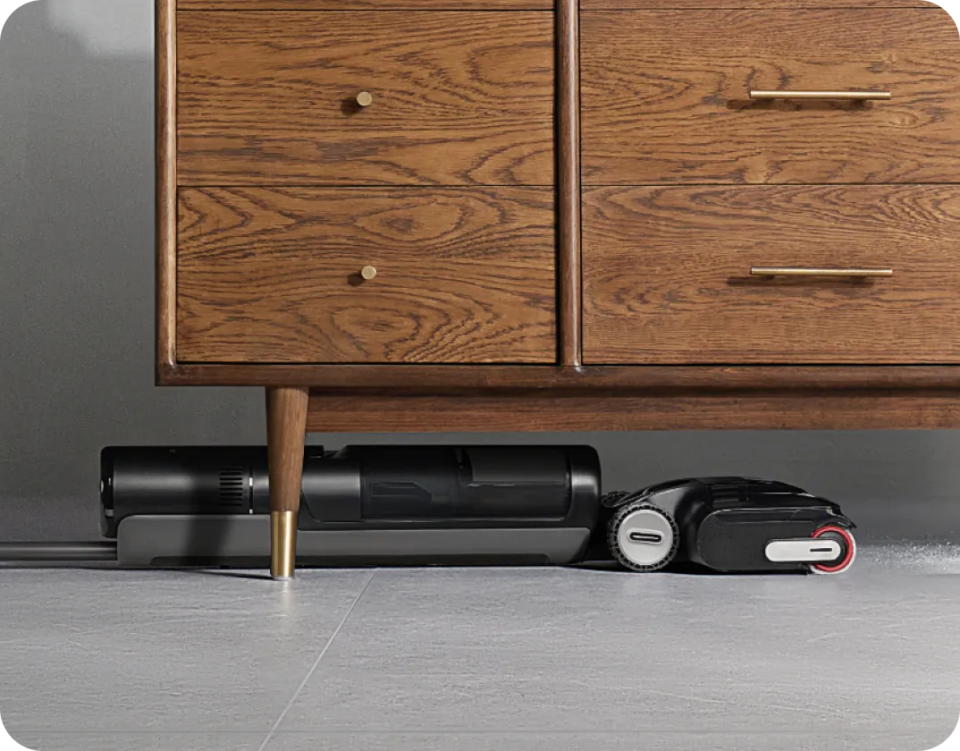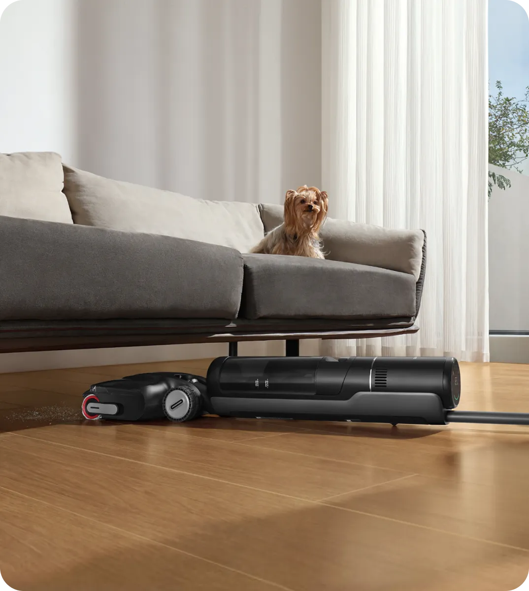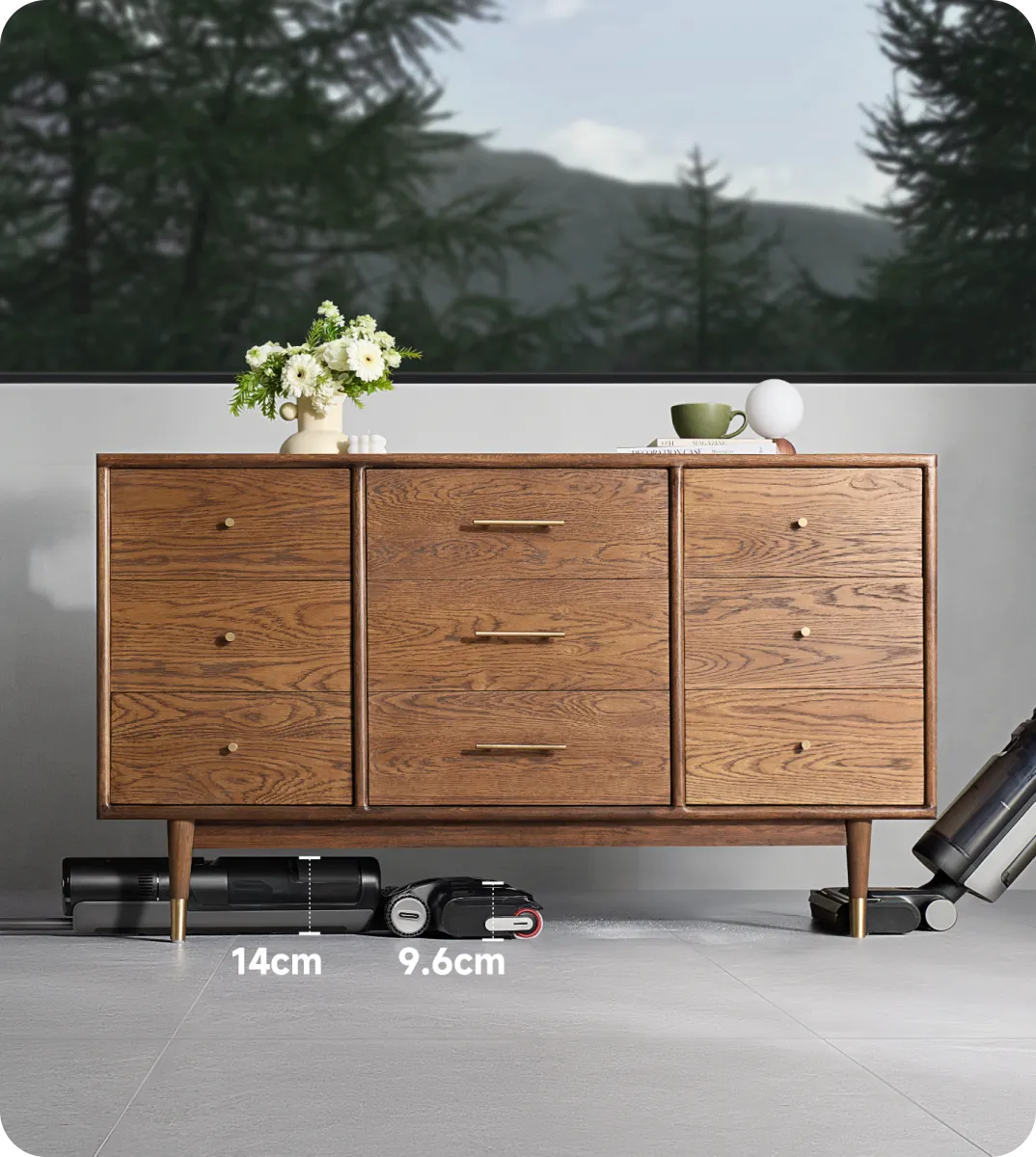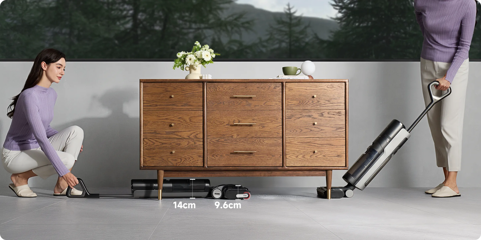 *180°, 14 cm, 9,6 cm: Hele støvsugerens kabinet kan nå områder helt ned til 14 cm, og børstehovedet kan nå helt ned til 9,6 cm. Baseret på vores interne laboratoriedata.