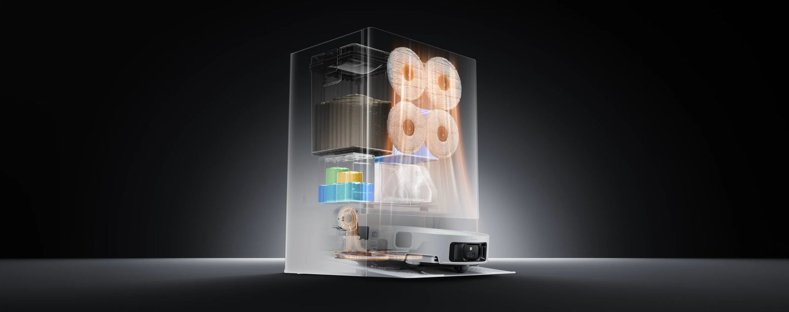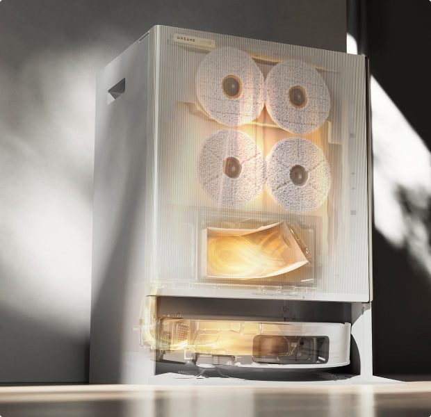 *DashDry™-system: Efter rengøring vil den først tørre mopperne og derefter tørre støvposen og støvbeholderen.