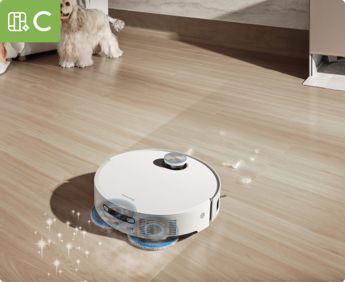 *Genvask af moppe og gulve er tilgængelig, når brugeren aktiverer denne funktion i CleanGenius™-tilstand i rengøringsappen.