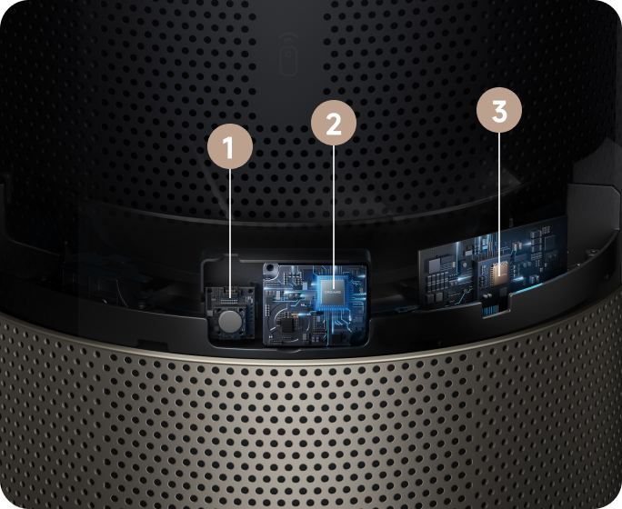 1Tredobbelt sensor registrerer HCOC, temperatur- og fugtighedsniveau2Partikelsensor (PM)3Spor TVOC-luftkvaliteten